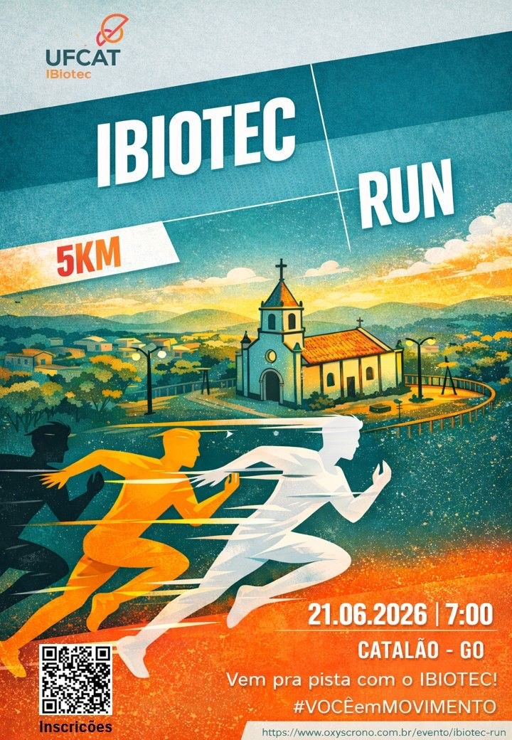 O IBiotec convida toda a comunidade de Catalão e região para participar da 1ª Corrida de Rua IBIOTEC RUN - 5km, que ocorrerá no dia 21 de junho de 2026, com concentração e largada às 7h no portão de entrada do câmpus 1 da UFCAT, localizado à rua Geraldo Belo da Silva, setor Universitário, Catalão-GO.